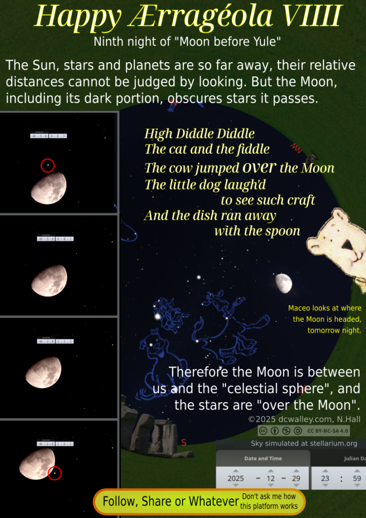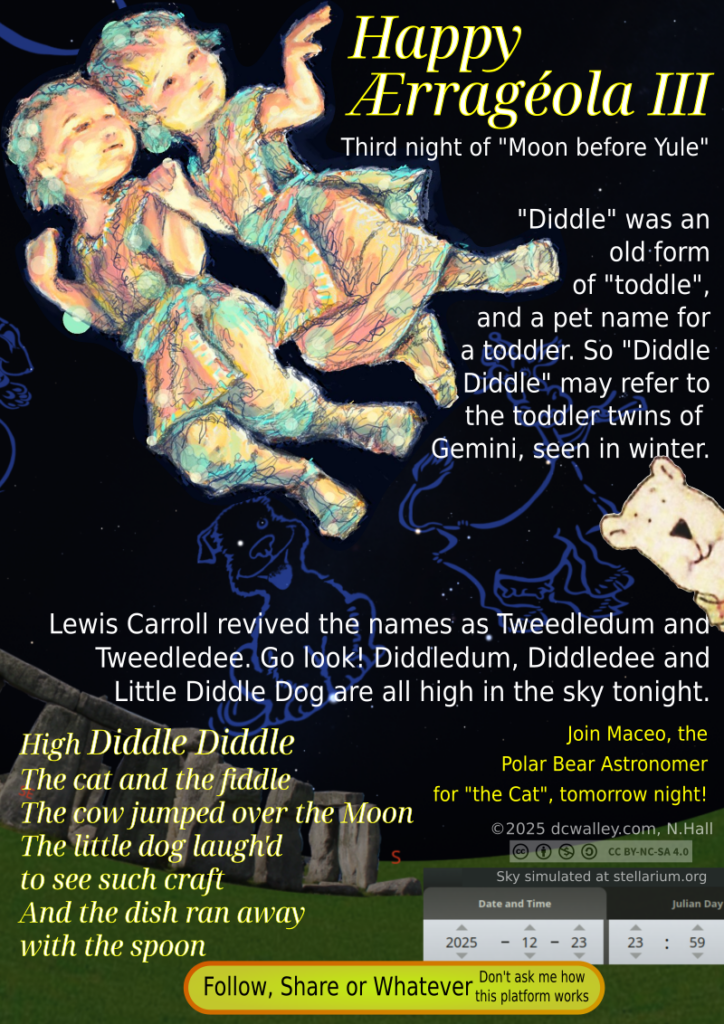 It appears that the critical alignment is the (nearly) full moon at its highest point, and the 2 brightest stars of Canis Minor. This happens close to the “cold moon”, the last full moon every year. The date of the cold moon is different each year, and it seems the closer it is to the winter solstice and/or Christmas, the better the alignment with North/South at midnight, and the rhyme. The spoon (the Little Dipper) is a reference to North, if not the North Star and true North. Finding true North allows us to find true South, and verify the near perfect alignment of the moon as it becomes full. While modern instruments can find the exact instant of the full moon, to the untrained observer, the moon appears full for a few days.